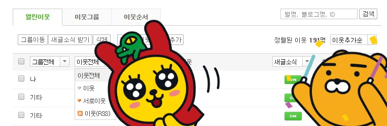 4. 열린 이웃에서 아래의 사진을 보시면 이웃 전체, 이웃, 서로이웃, RSS이웃을 구분할 수 있습니다.